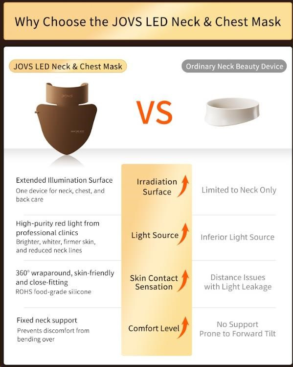 Zapomeňte na neefektivní krémy a několik různých přístrojů. Maska JOVS byla chytře navržena s rozšířenou ozařovací plochou, aby poskytla komplexní péči nejen krku, ale i dekoltu a horní části zad. Tyto oblasti jsou stejně jako obličej vystaveny slunci a projevům stárnutí, ale často na ně zapomínáme. S jedním zařízením tak můžete bojovat proti vráskám na krku, pigmentovým skvrnám v dekoltu a nedokonalostem na zádech.