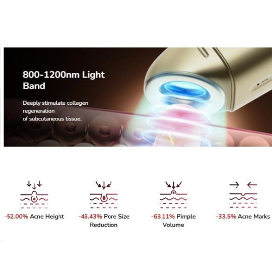 - Dvojitá rázová vlna světla: Kombinuje dvě pásma (400-600nm & 800-1200nm) pro komplexní účinek – ničení bakterií a regulaci mazu.