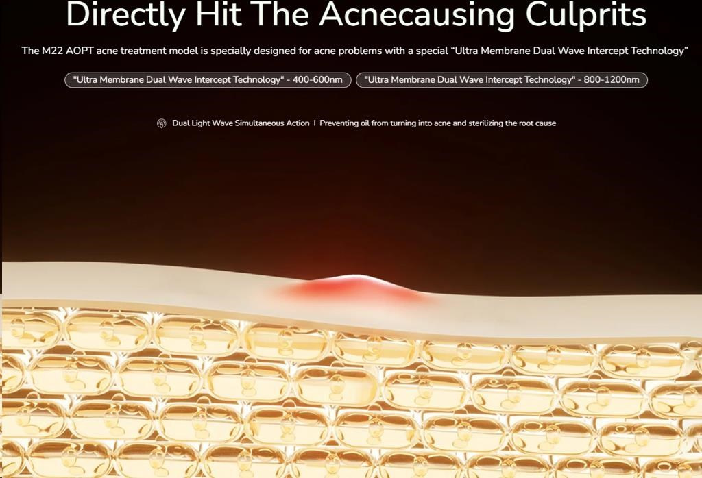 - Dvojitá rázová vlna světla: Kombinuje dvě pásma (400-600nm & 800-1200nm) pro komplexní účinek – ničení bakterií a regulaci mazu.