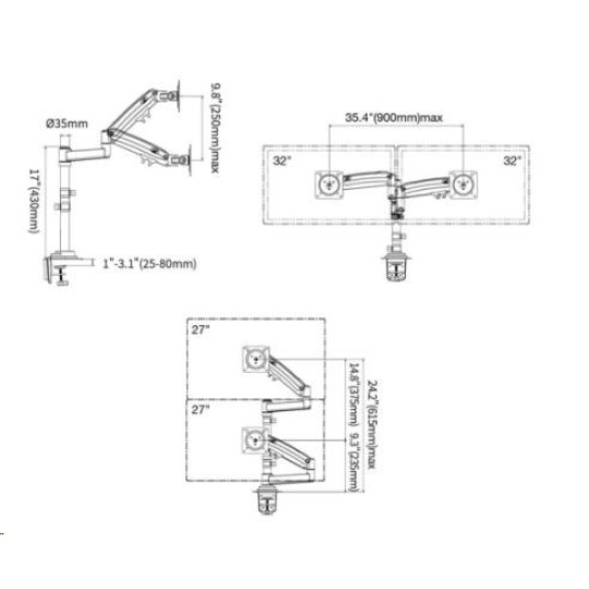 Monitorový držák na okraj stolu nebo do prostoru stolové desky, 19-32", otočný, sklopný, výsuvný, duální výškové polohování, pivot, systém pro uspořádání kabeláže, nosnost 18kg.