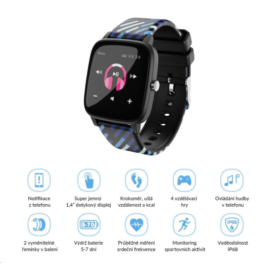 Prostředí hodinek a aplikace je kompletně v češtině, takže ovládání nebude pro dítě žádný problém. Hodinky lze přepnout do dalších jazyků a podporovat tak výuku angličtiny a dalších jazyků.