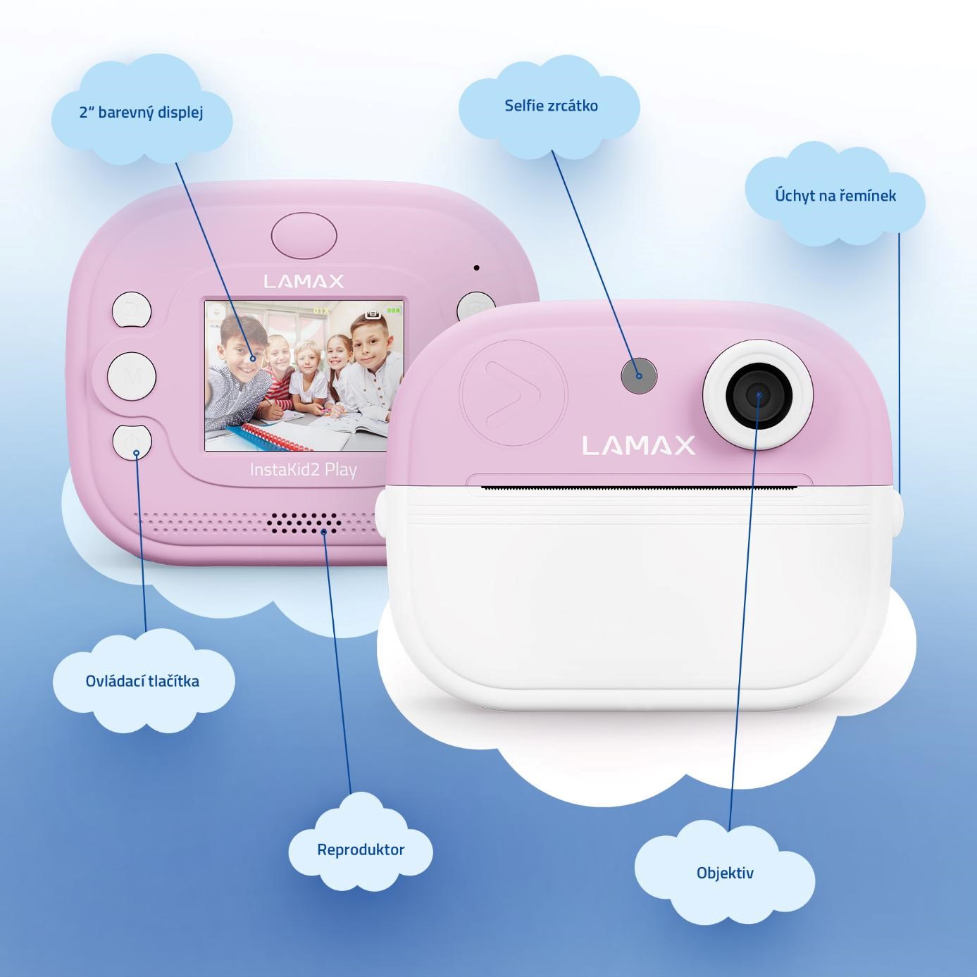 LAMAX InstaKid2 Play je foťák, který neztrácí čas. Děti si s ním jednoduše zaznamenají každý důležitý moment a během vteřiny ho mají v ruce. Černobílé snímky se mohou proměnit v barevné vzpomínky pomocí fixů, které jsou součástí balení – stačí je jen vybarvit, přidat do vlastního alba nebo jimi potěšit třeba babičku. Díky jednoduchému ovládání, dvěma ruličkám v balení (včetně samolepicí), originálnímu designu a výkonné kameře se 48 Mpx a FullHD videem, se foťák stane nepostradatelným společníkem na výlety, oslavy i tvořivá odpoledne s kamarády. Oblíbí si ho i starší děti, které si mohou své snímky i videa ukládat na microSD kartu a uchovat si tak své první filmařské pokusy. Na výběr je růžovánebo modrá varianta a nechybí ani praktická šňůrka na krk, aby měly děti foťák stále po ruce. A když zrovna nefotí? Zábavu zajistí pět her přímo ve fotoaparátu. Tento foťáček totiž není jen o vzpomínkách, je také o radosti, sebevyjádření a fantazii.