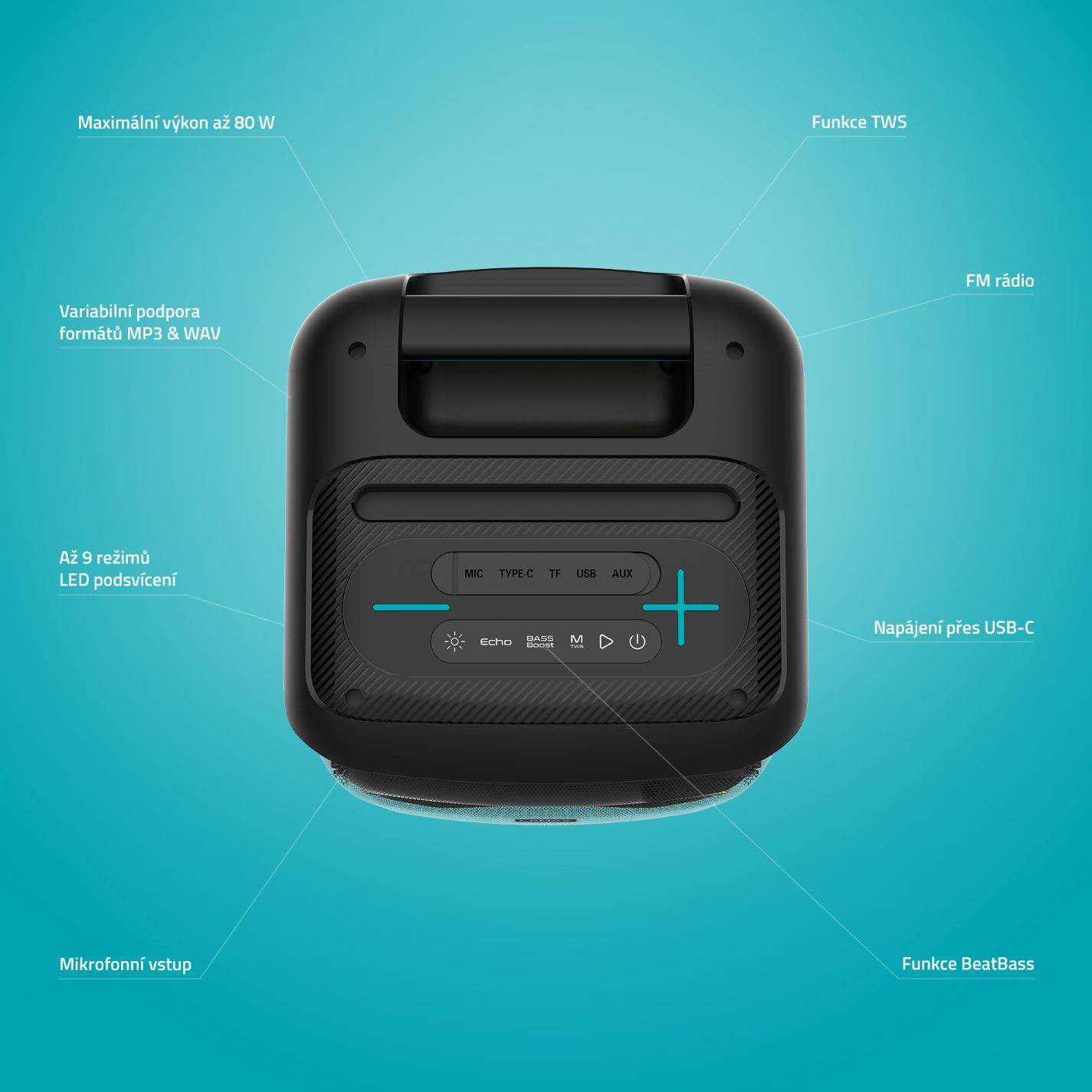 Reprák pracuje o maximálním výkonu 80 W, což už je slušný ozvučení.