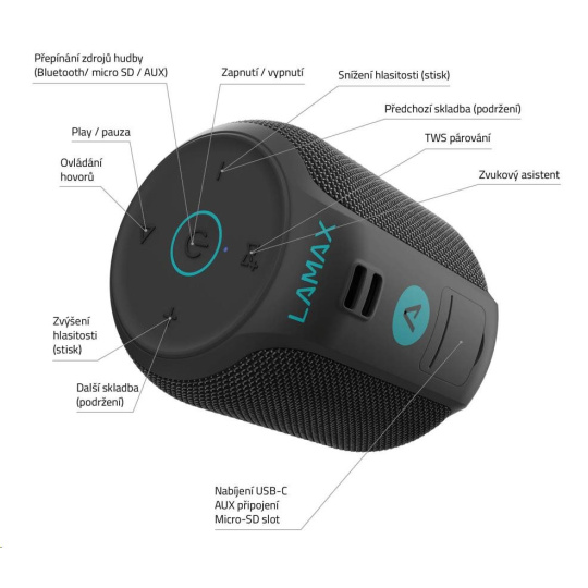 Strč svůj playlist do kapsyHoď se do pohody, ať už jsi doma nebo právě zdoláváš Mount Everest. LAMAX Sounder2 Mini naplní tvoje uši fresh zvukem a s výdrží až 30 hodin ho jen tak nevybiješ. Ať se chceš soustředit, vypnout nebo vyrazit ven, jeho prostorový 360° sound, snadná přenosnost a nejmodernější technologie jako Bluetooth 5.0 ti kdekoliv vytvoří atmosféru. S vysokou voděodolností klidně i uprostřed průtrže.