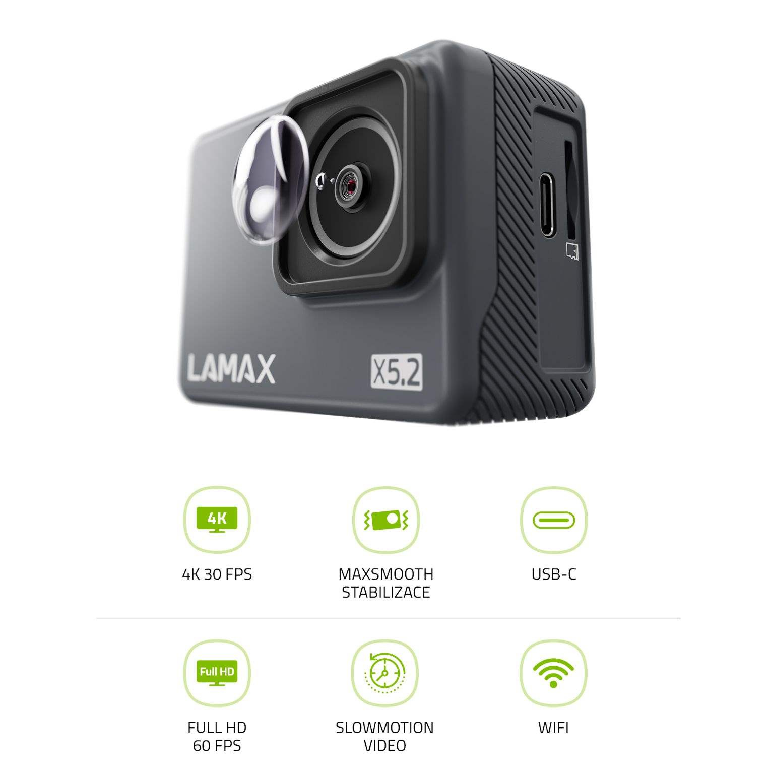 Kamera je vybavena přehledným 2“ TFT LCD displejem pro okamžité prohlédnutí záznamu. Tlačítky jednoduše nastavíš všechny funkce od časovače po spořič obrazovky. Menu je kompletně v češtině, takže si s kamerou budete rozumět. Originální LAMAX design a dokonalá kvalita se u modelu X5.2 potkávají se skvělou cenou. Parádní je i kapacita baterie, a když už šťáva dojde, skrze moderní USB-C ji zase doplníš.