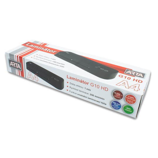 Laminátor dokumentů s možností volby tloušťky laminované fólie. Model ARTA G10 HD A4 umožňuje laminování dokumentů, které mají maximální šířku 235 mm (A4), s fóliemi o tloušťce 75 až 250 mikronů. Doba potřebná k ohřátí je pouze 60 sekund. Je snadno použitelný, malý, kompaktní a vyniká přítomností inteligentní funkce automatického vypnutí po 30 minutách nečinnosti. Součástí je také možnosti uvolnění zaseknutých dokumentů..