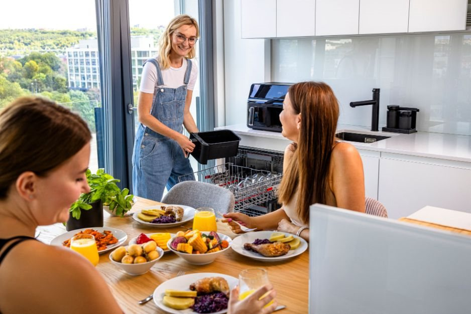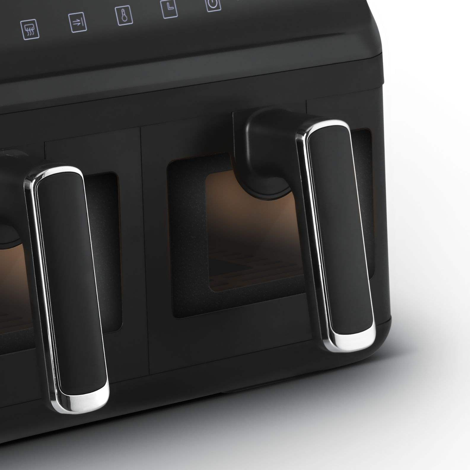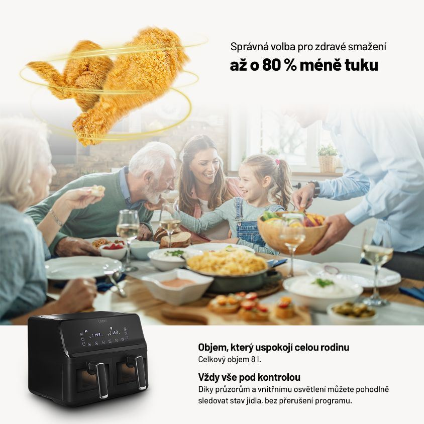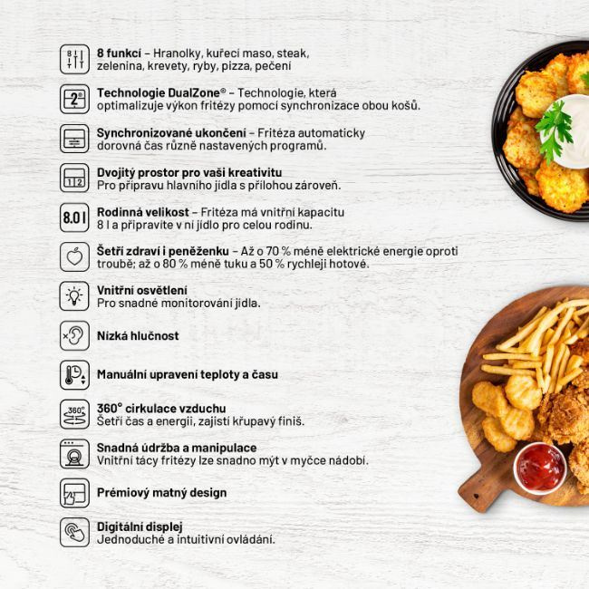 Horkovzdušná fritéza s dvěma koši, celkový objem 8 l, individuální nastavení obou košů zvlášť, možnost přípravy hlavního jídla a přílohy naráz, osvětlení interiéru, průhledná okénka pro vizuální kontrolu pokrmu, 8 přednastavených programů, možnost manuální úpravy času a teploty, technologie Cool Touch a Dualzone®, funkce předehřátí a synchronizované ukončení, přehledný dotykový displej, vnitřní tácy vhodné do myčky, prémiový matný design, 360° cirkulace horkého vzduchu, nastavitelná teplota: 80 – 200 °C, nastavení času 1 – 60 min, příkon 2700 W.