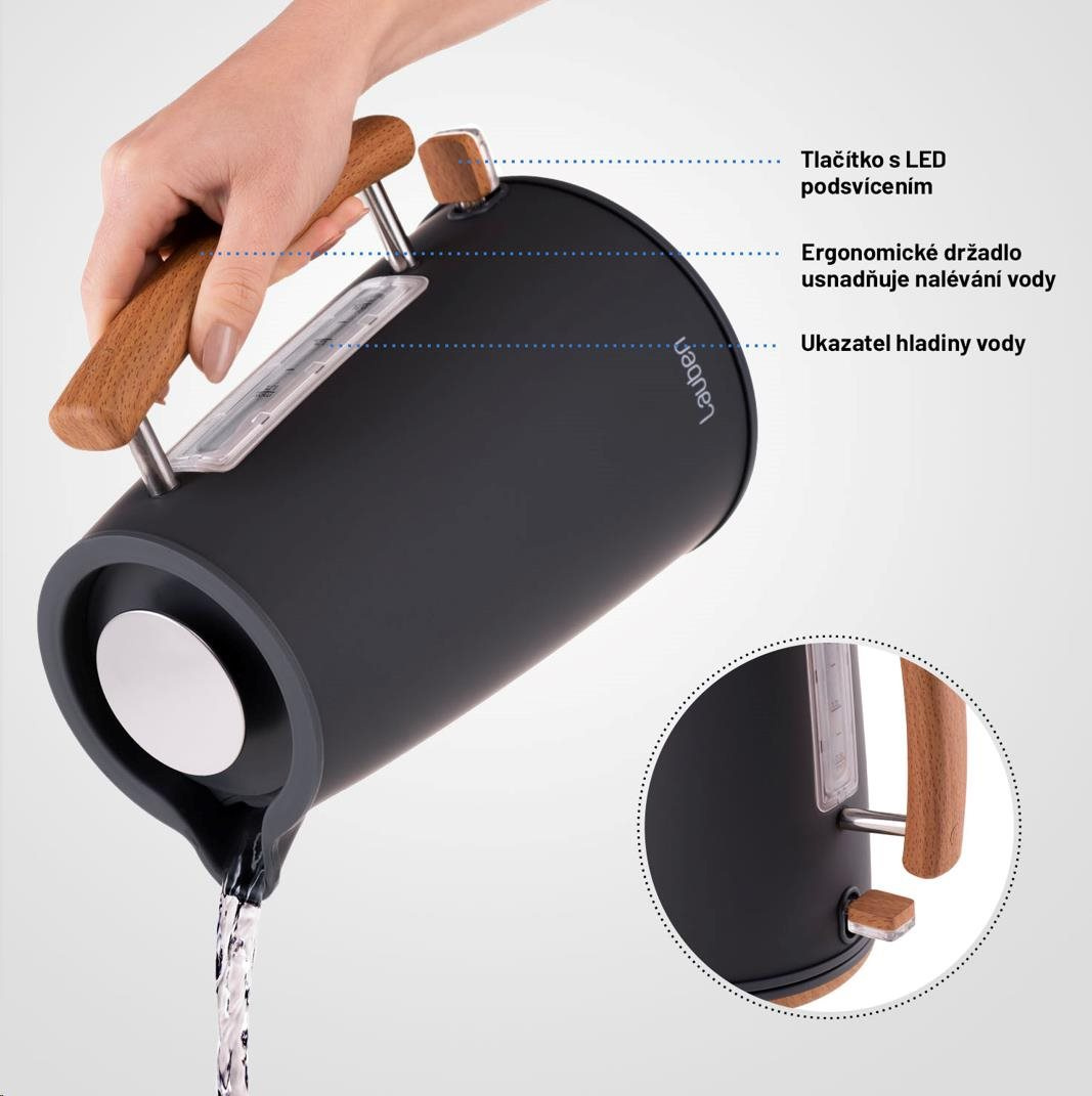I mezi rychlovarnými konvicemi lze najít tu, která dodá vaší kuchyni punc stylu a originality. Konvice Lauben je navržena v minimalistickém a vkusném severském designu, který se bude ve vaší kuchyni vyjímat. Tělo konvice je vyrobeno z #304 nerezové oceli. Pogumovaný povrch konvice v kombinaci s rukojetí v dřevěném dekoru vypadá na lince stylově. Hlavní vypínač konvice disponuje LED podsvícením.