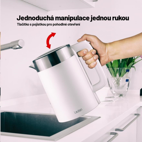 Teplotu volíte v rozmezí 60-100 °C po desetistupňových intervalech. V konvici Lauben ohřejete až 1,7 l vody naráz. Její aktuální množství vždy poznáte podle externího indikátoru. Víko konvice je opatřeno bezpečnostní pojistkou proti rozlití a otevíráte jej snadno, pomocí tlačítka umístěného na držadle.