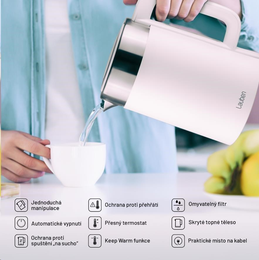 Poradí si s čajem, kávou i kojeneckou výživouLauben Electric Kettle EK17WS je designová rychlovarná konvice s nastavitelnou teplotou ohřevu vody a Keep Warm funkcí. Možnost nastavení teploty vody v kuchyni jistě oceníte. Potřebujete zalít zelený čaj? Už nikdy nemusíte čekat, až voda vychladne, stačí si preferovanou teplotu zvolit na přehledném LCD displeji.