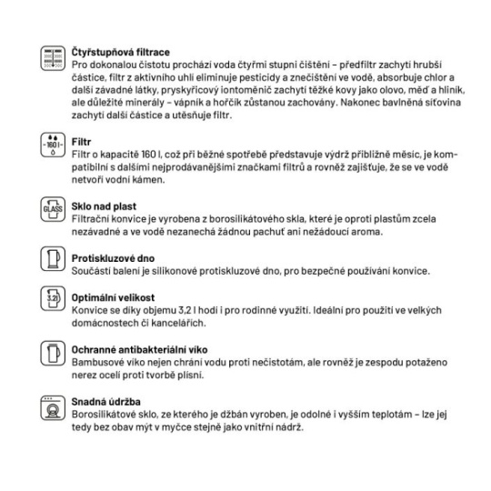 Není voda jako voda, když z kohoutkové odstraníte nežádoucí látky, bude nejen zdravější, ale také chutnější. Skleněná filtrační konvice Lauben Glass Water Filter Jug 3200GW si díky čtyřstupňovému filtračnímu systému hravě poradí se vším, co ve vodě mít nechcete, jako bakterie, mikroplasty, těžké kovy, pesticidy, herbicidy, hormony či chlór. Díky materiálu konvice ve vodě nezůstává ani žádná plastová pachuť. Výsledkem je voda podstatně lepší chuti i vůně, v níž zůstávají zachovány pouze důležité minerály. Filtr, kompatibilní s ostatními nejprodávanějšími značkami na trhu, rovněž zajistí, že se v konvici ani nikde jinde netvoří vodní kámen. Objem 3,2 l představuje dostatečné množství vody pro průběžné doplňování tekutin během celého dne. Bonusem je krásný design s bambusovým víkem, které je zespodu opatřeno nerez ocelí proti plísním, a silikonové protiskluzové dno pro větší bezpečnost, jež je součástí balení.