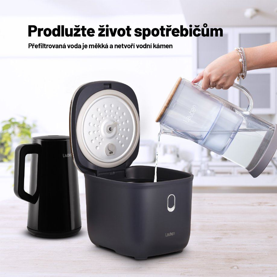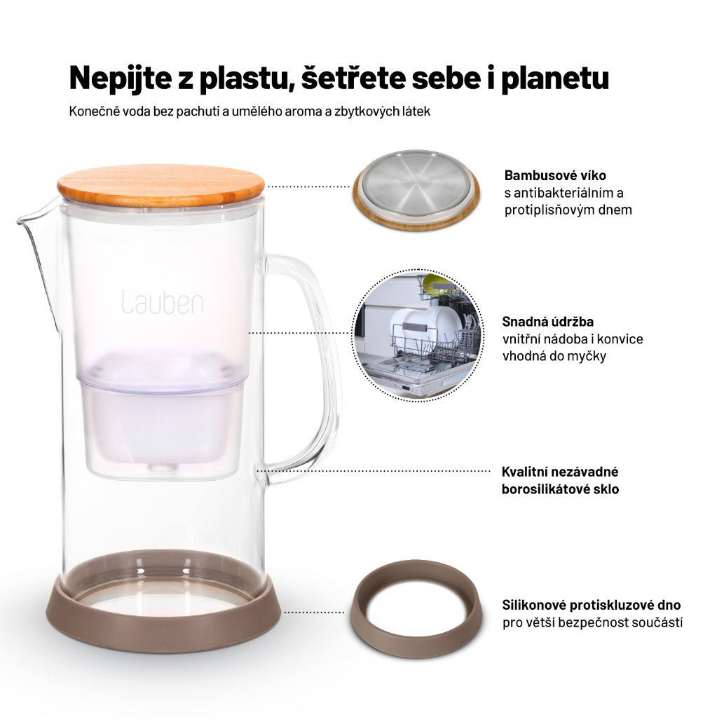 Není voda jako voda, když z kohoutkové odstraníte nežádoucí látky, bude nejen zdravější, ale také chutnější. Skleněná filtrační konvice Lauben Glass Water Filter Jug 3200GW si díky čtyřstupňovému filtračnímu systému hravě poradí se vším, co ve vodě mít nechcete, jako bakterie, mikroplasty, těžké kovy, pesticidy, herbicidy, hormony či chlór. Díky materiálu konvice ve vodě nezůstává ani žádná plastová pachuť. Výsledkem je voda podstatně lepší chuti i vůně, v níž zůstávají zachovány pouze důležité minerály. Filtr, kompatibilní s ostatními nejprodávanějšími značkami na trhu, rovněž zajistí, že se v konvici ani nikde jinde netvoří vodní kámen. Objem 3,2 l představuje dostatečné množství vody pro průběžné doplňování tekutin během celého dne. Bonusem je krásný design s bambusovým víkem, které je zespodu opatřeno nerez ocelí proti plísním, a silikonové protiskluzové dno pro větší bezpečnost, jež je součástí balení.
