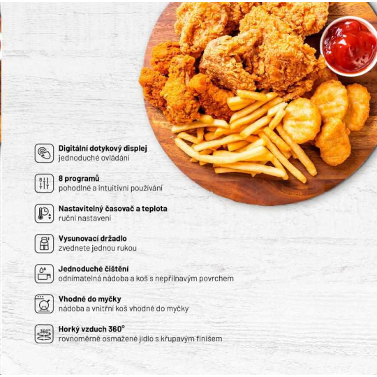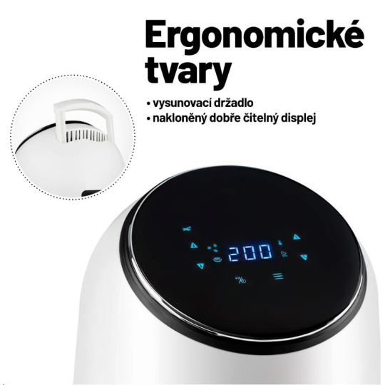 Fritéza se velmi snadno ovládá díky přehlednému dotykovému displeji a hlavní části je možné mýt v myčce nádobí. Potěší vás i vkusný minimalistický design.