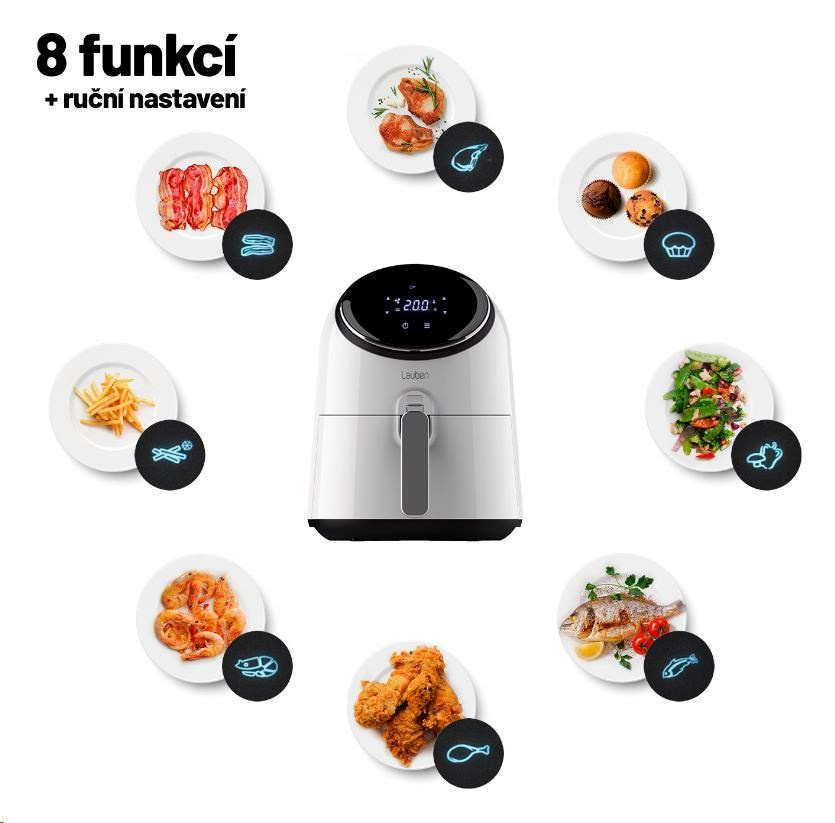 Při přípravě jídla s horkovzdušnou fritézou Lauben máte na výběr z 8 režimů, které jsou ušité na míru konkrétním surovinám. Pokud si nevyberete, je možné si nastavit požadovanou teplotu a dobu smažení dle vlastních preferencí. Tak či tak, výsledkem vždy budou rovnoměrně osmažené suroviny s křupavým finishem, ať už připravujete slaninu k anglické snídani, krevetky v tempuře nebo poctivé domácí hranolky.