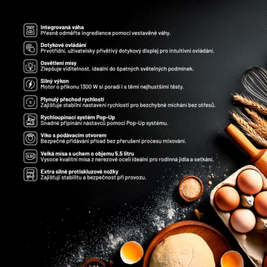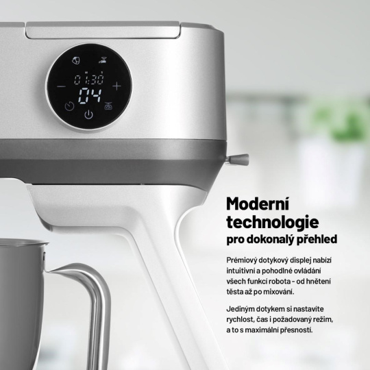 Kuchyňského robota využijete nejen při přípravě těst, ale jeho bohaté příslušenství umožňuje také mixovat, krouhat či mlít. V balení tak naleznete skleněný mixér, struhadlo na zeleninu, mlýnek na maso či výrobník klobás, a veškeré příslušenství vyměníte velmi snadno pomocí zvedacího ramene s pop-up systémem. Prostřednictvím prémiového dotykového displeje máte všechny procesy pod kontrolou, jednoduše nastavíte rychlost a vše potřebné.
