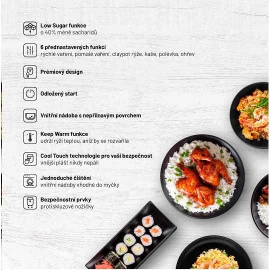 Rýže s až o 40 % nižším obsahem sacharidůLauben Low Sugar Rice Cooker je víceúčelový prémiový rýžovar s funkcí low sugar, při níž díky speciální technologii vaření dochází k separaci sacharidů. S tímto pomocníkem dovedete k dokonalosti všechny druhy rýže a díky 6 nastavitelným režimům rychle vytvoříte zdravá a chutná jídla i z dalších surovin. S rýžovarem Lauben připravíte luštěniny, polévku nebo třeba ovesnou kaši, aniž byste zapnuli sporák.