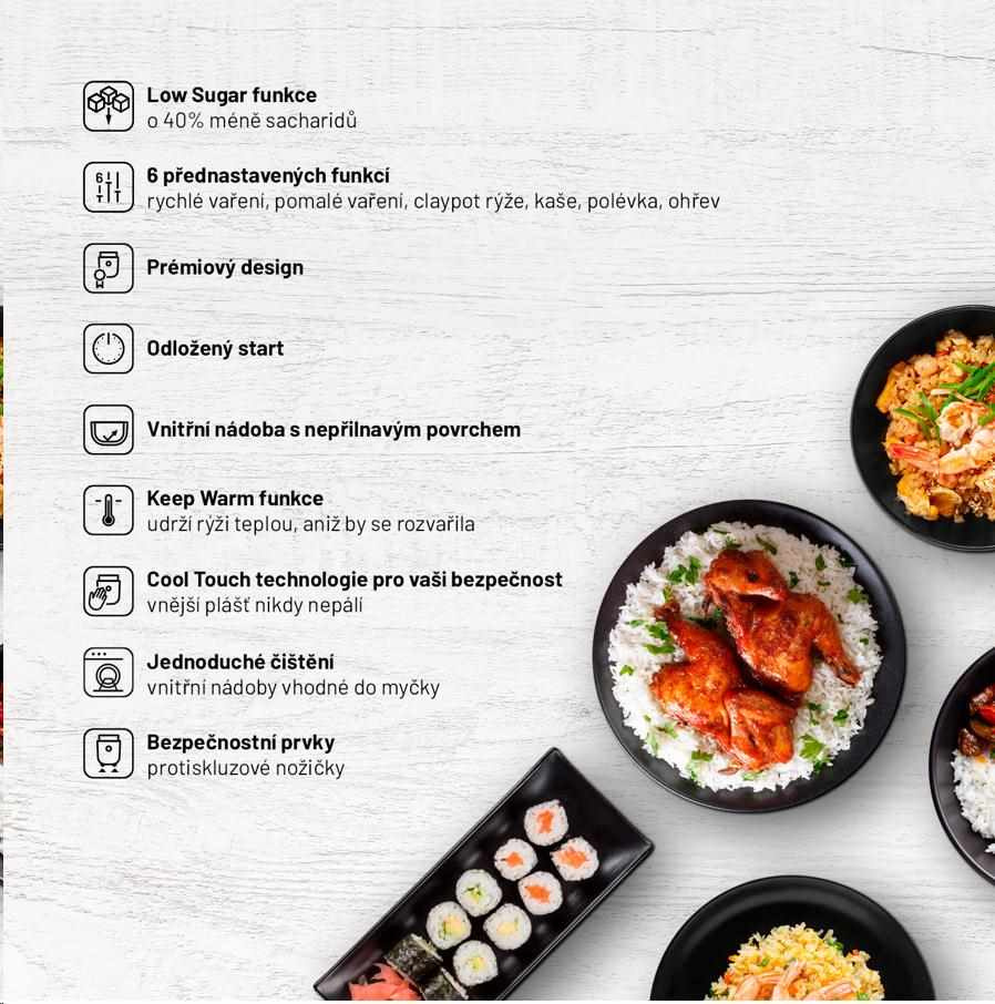 Rýže s až o 40 % nižším obsahem sacharidůLauben Low Sugar Rice Cooker je víceúčelový prémiový rýžovar s funkcí low sugar, při níž díky speciální technologii vaření dochází k separaci sacharidů. S tímto pomocníkem dovedete k dokonalosti všechny druhy rýže a díky 6 nastavitelným režimům rychle vytvoříte zdravá a chutná jídla i z dalších surovin. S rýžovarem Lauben připravíte luštěniny, polévku nebo třeba ovesnou kaši, aniž byste zapnuli sporák.
