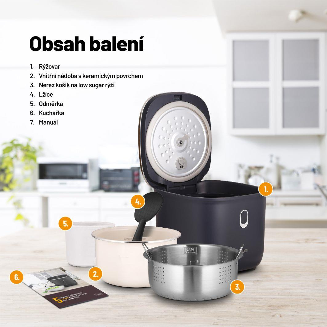 Zbaví vás až 40 % sacharidů v rýžiChcete-li jíst zdravěji, víceučelový rýžovar Lauben Low Sugar Rice Cooker 3000AT vám nesmí chybět. Jeho funkce low sugar zbaví rýži až 40 % sacharidů. Přístroj si poradí se všemi druhy rýže, ale i s dalšími surovinami, například luštěninami. Zvolit můžete ze 6 režimů, které je ale možné ručně upravit. Prémiový nepřilnavý keramický povrch jeho 3l nádoby připraví jídlo pro celou rodinu bez nutnosti použití tuku a obav z připálení. Potěší funkcí Keep Warm, která udrží pokrmy teplé bez nebezpečí rozvaření, odložený start či ochrana proti přetečení a technologie Cool Touch, jejíž zásluhou se o rýžovar nepopálíte. Dotyková tlačítka usnadňují nastavení rýžovaru. Snadná údržba je samozřejmostí, stačí dát vnitřní části do myčky. Pro inspiraci jsme přibalili také kuchařku.