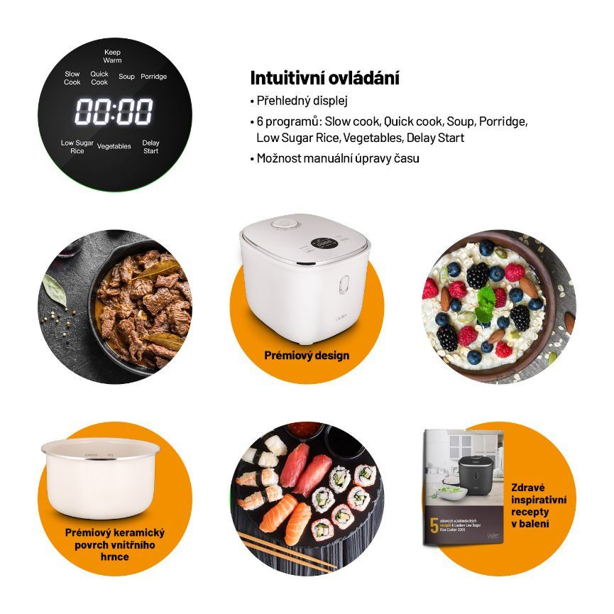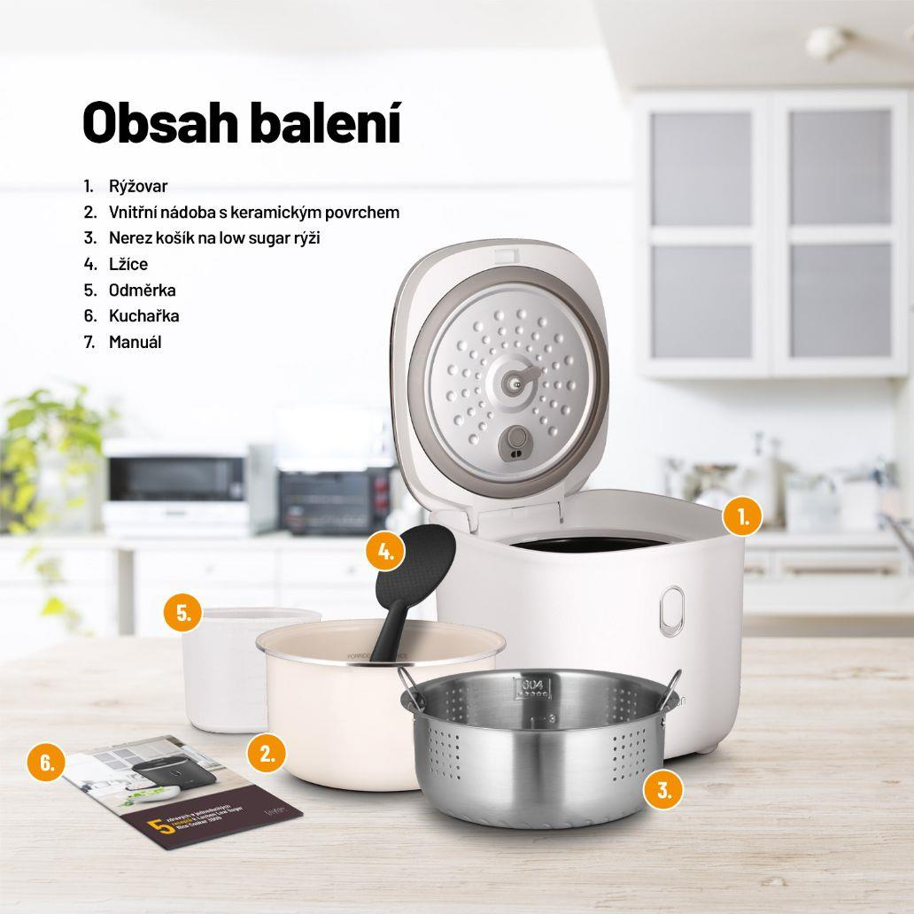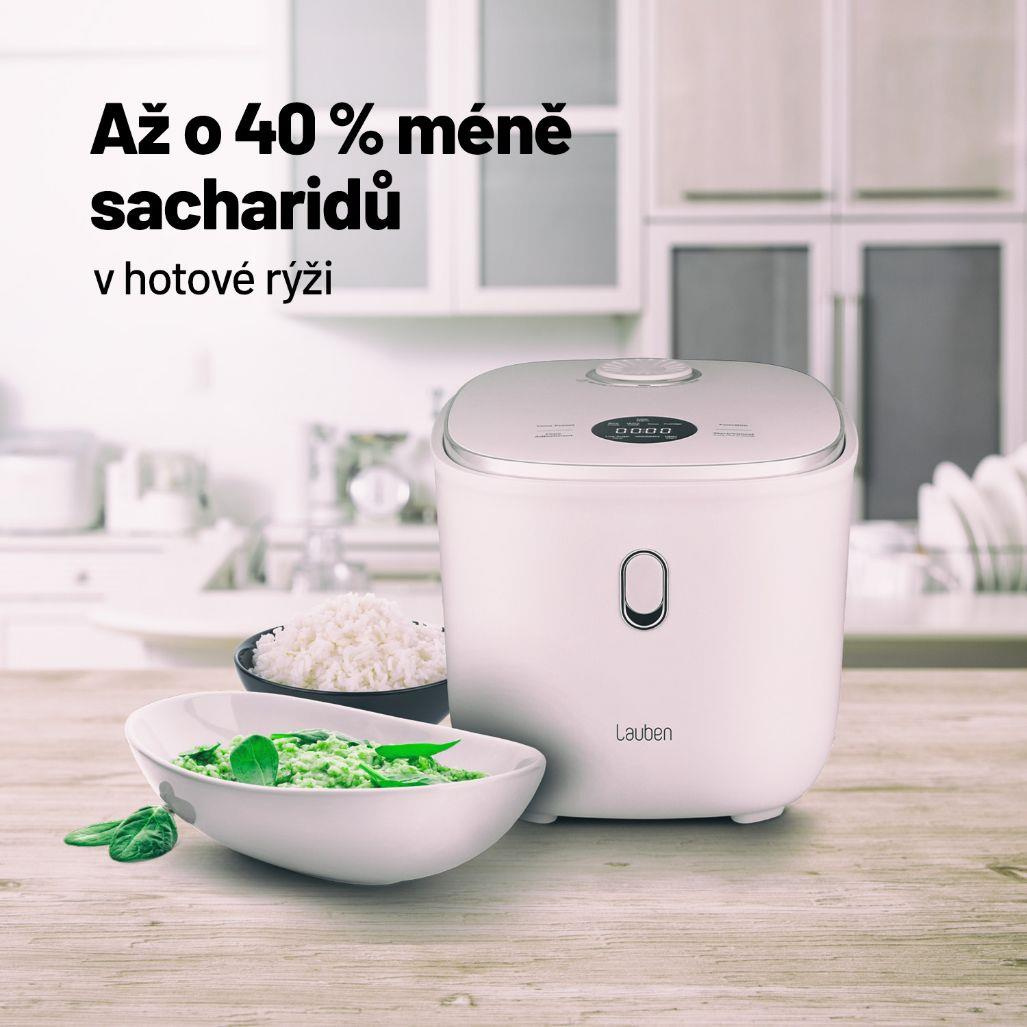 Zbaví vás až 40 % sacharidů v rýžiChcete-li jíst zdravěji, víceučelový rýžovar Lauben Low Sugar Rice Cooker 3000WT vám nesmí chybět. Jeho funkce low sugar zbaví rýži až 40 % sacharidů. Přístroj si poradí se všemi druhy rýže, ale i s dalšími surovinami, například luštěninami. Zvolit můžete ze 6 režimů, které je ale možné ručně upravit. Prémiový nepřilnavý keramický povrch jeho 3l nádoby připraví jídlo pro celou rodinu bez nutnosti použití tuku a obav z připálení. Potěší funkcí Keep Warm, která udrží pokrmy teplé bez nebezpečí rozvaření, odložený start či ochrana proti přetečení a technologie Cool Touch, jejíž zásluhou se o rýžovar nepopálíte. Dotyková tlačítka usnadňují nastavení rýžovaru. Snadná údržba je samozřejmostí, stačí dát vnitřní části do myčky. Pro inspiraci jsme přibalili také kuchařku.