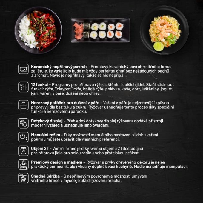 Dopřejte si více času na jiné aktivity a vaření přenechte multifunkčnímu rýžovaru, jehož 12 přednastavených programů si poradí s přípravou nejrůznějších pokrmů. Programy jako rýže, "claypot" rýže, hnědá rýže, polévka, kaše, dort, luštěniny, jogurt, kari, vaření v páře, dušení či ohřev jsou zárukou snadného a rychlého vaření. Prémiový keramický povrch vnitřního hrnce navíc neuvolňuje žádnou nežádoucí pachuť ani aroma, příprava pokrmů je tak zdravější. Pokud chcete svůj životní styl ještě vylepšit, využijte nerezového pařáčku pro dušení v páře.
