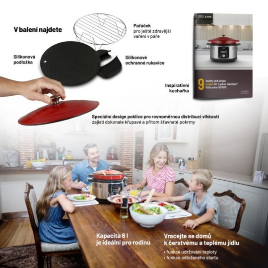 Všestranný pomocník pro moderní domácnostVíceúčelový Lauben OvenSafe® Multicooker 6000RS rozhodně nedělá ostudu svému označení. Vnitřní hrnec je poctivý litinový se smaltovaným povrchem – jako od babičky! Díky technologii OvenSafe® lze bez obav vložit do trouby či postavit na různé typy sporáků, zvládá teplotu až 250°C. Protože je 21. století v plném proudu, nádobu o objemu 6 l lze vložit i do multicookeru a rázem máte k dispozici 10 přednastavených programů pro snadné a rychlé vaření. Teplotu a čas je však možné upravit i ručně. Důležitou součástí hrnce je poklice, ta je navržená tak, aby k distribuci vlhkosti uvnitř docházelo rovnoměrně. Litina dokonale absorbuje a vede teplo a tím je vaření energeticky úspornější, smaltovaný povrch zabraňuje korozi. Jídlo připravíte snadno i v páře díky přiloženému pařáčku. Šikovnými pomocníky jsou funkce pro udržování teploty a odložený start. Manipulaci usnadňují přiložené silikonové rukavice a podložka, inspiraci přináší kuchařka.