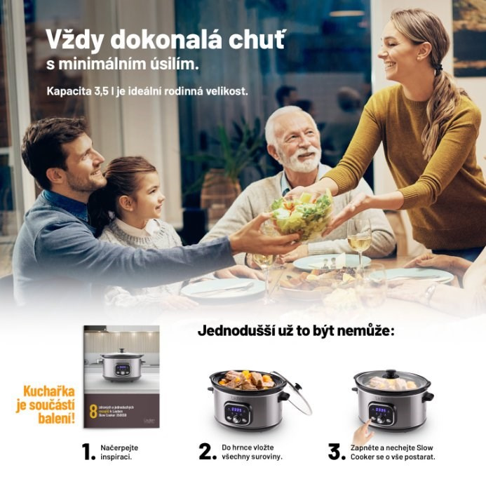 Pomalé vaření uspoří čas strávený v kuchyni. Zní to nepravděpodobně, ale je to tak. Pomalý hrnec totiž vaří sice pomalu, ale sám. Do hlavní nádoby umístíte všechny ingredience, stisknete tlačítko a o zbytek se postará hrnec. Už jste někdy připravili guláš bez stání u plotny za neustálého hlídání a míchání? Představte si, že stisknete večer tlačítko, jdete si číst nebo cvičit, o kuchyň se nestaráte, a ráno je oběd hotový a ještě ke všemu perfektní. S Lauben Slow Cooker 3500SB se tato představa stává realitou.