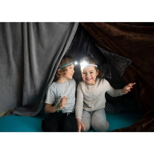Dětské čelovky s motivy duhy nebo dinosaurů, výkon 5-40 lm, bílé, modré a červené světlo, doba svícení až 18 hod, šetrné pro dětský zrak, bezpečný kryt dobíjecího akumulátoru, snadné ovládání.