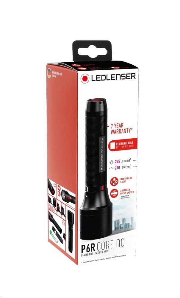 Kompaktní ruční svítilna LEDLENSER P6R QC je vybavena technologií produkující čtyři různě barevná světla. Je proto oblíbena především mezi lovci, kteří krom klasického bílého světla (s výkone až 270 lm) využijí také červené světlo (pro neoslňující noční osvětlení), zelené světlo (pro sledování zvěře) a modré světlo (pro dohledávání). Dobíjecí akumulátor vydrží svítit na jedno nabití až 120 hodin. Svítilna je vybavena též barevným stroboskopem a díky IP5 je odolná proti prachu i stříkající vodě.