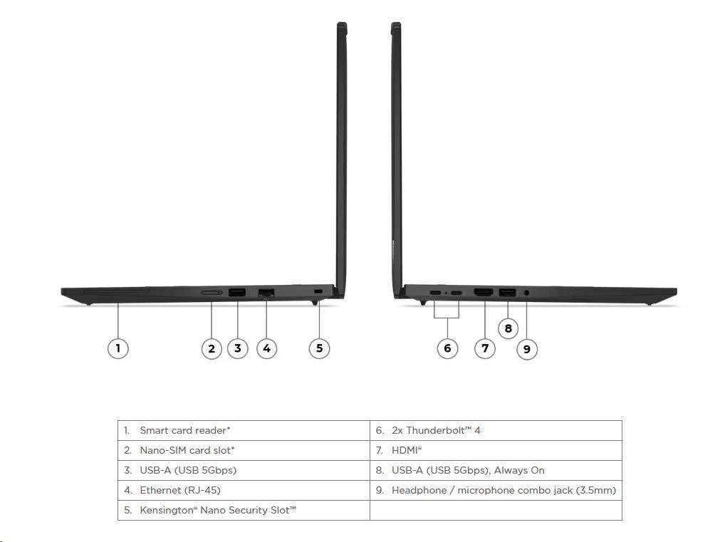 | Standartné porty | 1x USB-A (USB 5Gbps / USB 3.2 Gen 1) 1x USB-A (USB 5Gbps / USB 3.2 Gen 1), Always On 2x USB-C® (Thunderbolt™ 4 / USB4® 40Gbps), with USB PD 3.0 and DisplayPort™ 2.1 1x HDMI® 2.1, up to 4K/60Hz 1x Headphone / microphone combo jack (3.5mm) 1x Ethernet (RJ-45) 1x Smart Card Reader 1x Nano-SIM Card Slot |