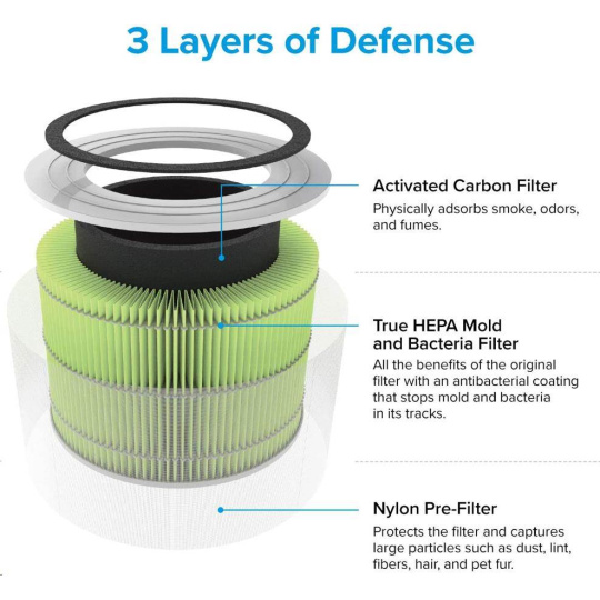 Druhou vrstvou je HEPA filtr H13. To odlišuje Levoit od konkurence, protože filtr HEPA H13 je mnohem kvalitnější a spolehlivější než běžně používané HEPA H11. Tu se odfiltrují jemné prachové částice, plíseň, bakterie, pyl, kouřové částice, roztoče a srst.