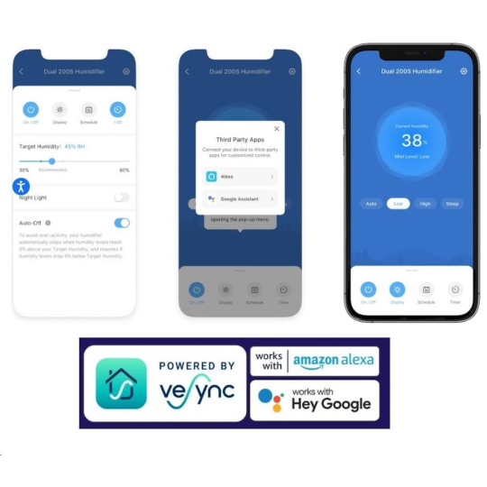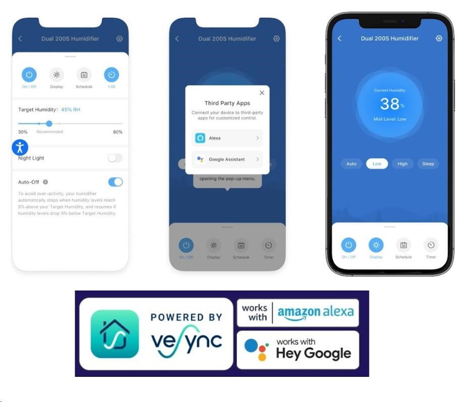 Zvlhčovač vzduchu Levoit Dual 200S Smart lze ovládat přímo na přehledném podsvíceném LED displeji nebo také přes aplikaci na chytrých zařízeních Apple nebo Android. Nebo si ho můžete dokonce připojit do svého Smart Home a ovládat hlasem přes Google Assistant nebo Amazon Alexa. Senzor vlhkosti zobrazuje vlhkost v reálném čase a v automatickém režimu tak okamžitě reaguje na změny vlhkosti. Vždy by se mělo jednat o rozmezí mezi 40 % až 60 %. Přes aplikaci si můžete informace kontrolovat nebo si své režimy plánovat.