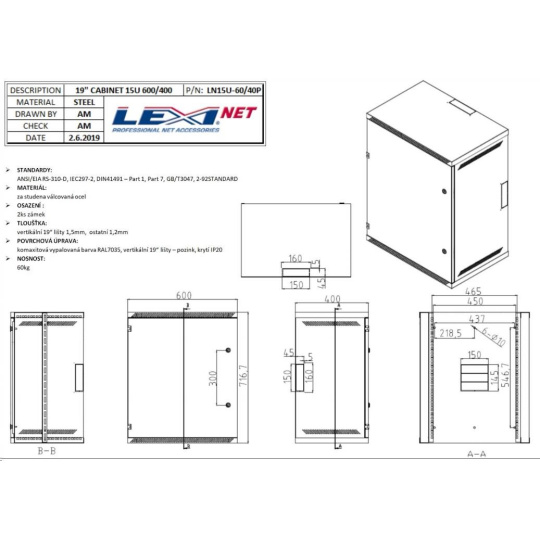 | Tloušťka: | vertikální 19" lišty 1,5mm ostatní 1,2 mm |