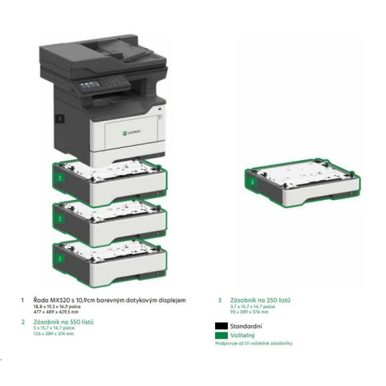 Obsah balení Napájecí kabely Prohlášení o omezené záruce List stability a bezpečnostní list nebo brožura Informace o programu sběru kazet Lexmark Multifunkční laserová tiskárna Lexmark MX522adhe Zahrnuje pevný disk. Tonerová kazeta Starter vratného programu až na 6000 stránek* Zobrazovací jednotka z programu Return Program Disk CD Software and Documentation Instalační příručka nebo list (síťové a místní připojení) *Průměrný počet vytištěných stránek při souvislém jednostranném tisku je 6000 standardních stránek. Udaná kapacitní hodnota je v souladu se směrnicí ISO/IEC 19752. Síťový kabel (Ethernet), kabel USB nebo paralelní kabel není součástí dodávky. Obsah balení se může lišit podle země nebo prodejce. Informace mohou být změněny bez předchozího upozornění. Obecné specifikace Část č. 36S0850 Technologie tisku Monochrome Laser Funkce Copying Color Scanning Printing Network Scanning Faxing Velikost pracovní skupiny Středně velká pracovní skupina Displej Lexmark e-Task 4,3 palcová (10,9 cm) barevná dotyková obrazovka Podporované rozměry médií A6, Oficio, 7 3/4 Envelope, 9 Envelope, JIS-B5, A4, Legal, A5, Letter, Statement, Executive, Universal, DL Envelope, Folio, 10 Envelope Manipulace s papírem zahrnuta 100-Sheet Multipurpose Feeder, Integrated Duplex, Výstupní přihrádka na 150 listů, Integrovaný zásobník na 250 listů Standardní porty Gigabit Ethernet (10/100/1000), Přední port USB 2.0 Specification Hi-Speed Certified (typ A), Zadní port s certifikací USB 2.0 Hi-Speed (typ A), Port USB 2.0 Specification Hi-Speed Certified (typ B), Jeden interní slot na karty Rozměry (V x D x Š) 477 x 489 x 429.5 mm Hmotnost 20.6 kg Rozměry balení (V x D x Š) 614 x 511 x 576 mm Hmotnost balení 23.90 kg Kopírování Rychlost kopírování Až: černobíle: 44 kopií/min.1 (A4) Rychlost kopírování oboustranně Až: černobíle: 23 str./min. (A4) Čas první kopie Černobíle: 6 sekund Rozsah zmenšení / zvětšení 25 - 400 % Faxování Rychlost modemu ITU T.30, V.34 Half-Duplex, 33.6 kb/s Rychlost přenosu faxů < 3 seconds per page Tisk Rychlost tisku 44 str./min. Rychlost tisku oboustranně) Až: černobíle: 23 str./min. (A4) Čas první stránky černobíle: 6 sekund Rozlišení tisku černobílého: 1200 x 1200 dpi, Kvalita 2400, 600 x 600 dpi, Kvalita 1200 Duplexní oboustranný: Integrated Duplex Oblast tisku 4.0 mm od všech okrajů (včetně) Skenování Typ skeneru / Skenování s automatickým podavačem dokumentů Flatbed scanner with ADF DADF (jednoprůchodový duplex) Skenovací plocha mm: 215.9 x 355.6 mm (maximálně) A4/Ltr Rychlost skenování Až: černobíle: 42 / 45 stran za minutu barevně: 22 / 24 stran za minutu A4/Ltr Rychlost skenování Až: oboustranně: 84 / 90 stran za minutu (černobíle) oboustranně: 44 / 48 stran za minutu (barevně) Technologie skenování CIS Rozlišení skenování 1200 X 600 ppi (černobíle) up to 600 X 600 ppi (color) Formáty naskenovaného souboru Odeslat jako: XPS, TIFF, Highly compressed PDF (1GB RAM and hard disk required), Archival PDF (A-1a, A-1b), Secure PDF, Searchable PDF (optional OCR with 1GB RAM and hard disk required), PDF, JPEG, JPG Cíle skenování e-mail, Lexmark Document Solutions Suite (LDSS), USB or Network connected computer, USB Flash drive, FTP ADF Automatický podavač dokumentů na 50 listů Kapacita vstupu papíru / Kapacita výstupu papíru Až: APL: 50 stránek APL: 50 stránek A4/Ltr Rychlost skenování 84 / 90 stran za minutu 44 / 48 stran za minutu A4/Ltr Rychlost skenování 42 / 45 stran za minutu 22 / 24 stran za minutu Manipulace s papírem Podporované typy médií Papírové štítky, Tvrdý papír, Obyčejný papír, Transparencies, Envelopes, vinylové štítky, viz Card Stock & Label Guide Možnost dokončování No Počet vstupů papíru standardně: 2 maximálně: 5 Kapacita vstupu papíru standardně: 350 stránek maximálně: 2000 stránek 350 stránek Kapacita výstupu papíru Až: standardně: 150 stránek maximálně: 150 stránek Podporovaný rozsah gramáže papíru 60 - 120 g/m2 (standardní zásobník) Doporučený měsíční objem tisku 2000 - 15000 stránek2 Maximální měsíční funkční cyklus 120000 stránek za měsíc3 Kazety a zobrazování Počty vytištěných stránek u kazet pro tiskárny až: 15,0004 -page High Yield Cartridge Kazeta na 6 0004 stran Extra vysokokapacitní kazeta na 20 0004 stran Ultra vysokokapacitní kazeta na 25 0004 stran Odhadovaný počet vytištěných stránek na zobrazovací válec Max.: 60000 stran při tisku 3 běžných stran/A4 na jednu tiskovou úlohu a při 5%pokrytí5 Tisková náplně dodávány s produktem První tonerová kazeta na 6 0000 stran, zařazená do vratného programu Náhradní kazety: Product functions only with replacement cartridges designed for use in a specific geographical region. See www.lexmark.com/regions for more details. Hardware Procesor Quad Core, 1200 MHz Paměť standardně: 2048 MB maximálně: 2048 MB Pevný disk Součástí konfigurace Jazyk tiskárny standardně: PCL 5e Emulation, PCL 6 Emulation, Microsoft XPS (XML Paper Specification), Personal Printer Data Stream (PPDS), PostScript 3 Emulation, PDF 1.7 emulation, Direct Image, AirPrint™ Fonty a znakové sady 2 PCL bitmap fonts, OCR-A, OCR-B scalable PCL 5e fonts, For more information, refer to the Technical Reference., 84 scalable PCL fonts, 91 škálovatelných PostScript fontů, 3 of 9 scalable PCL 5e fonts in Narrow, Regular and Wide, 5 PPDS bitmap fonts, 39 scalable PPDS fonts Dotykový displej Yes Možnosti připojení Přímé USB Yes Síť Ethernet Yes Bezdrátová Bezdrátové příslušenství Podpora síťových protokolů TCP/IP IPv6, TCP/IP IPv4, AppleTalk™, TCP, UDP Metody síťového tisku LPR/LPD, Direct IP (Port 9100), Pull Printing, Microsoft Web Services WSD, Secure IP (Port 96xx), FTP, TFTP, Enhanced IP (Port 9400), ThinPrint .pr