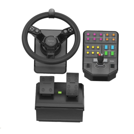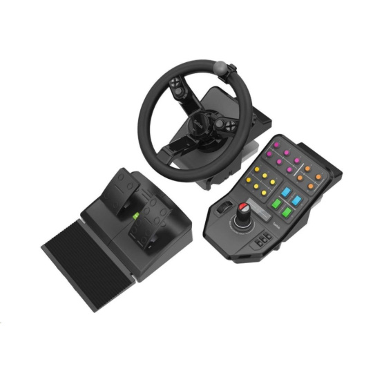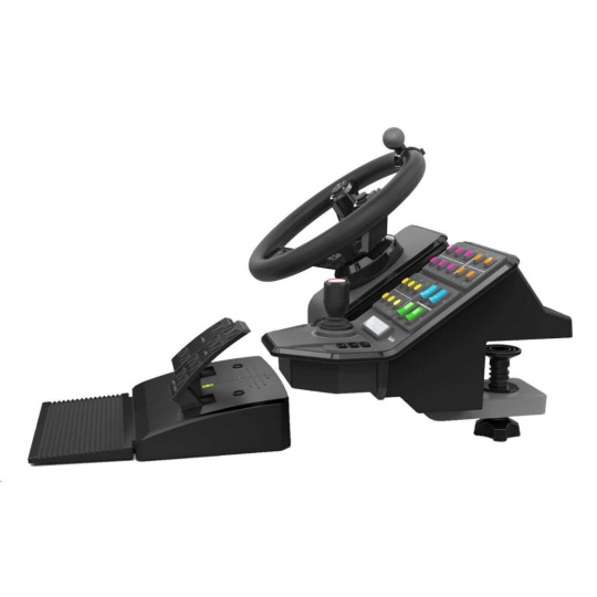 | Package contents | - Heavy equipment wheel with 2 m USB connector cable - Gas and brake pedal set with 1.8 m USB connector cable - Side panel control deck with 2 m USB connector cable  |