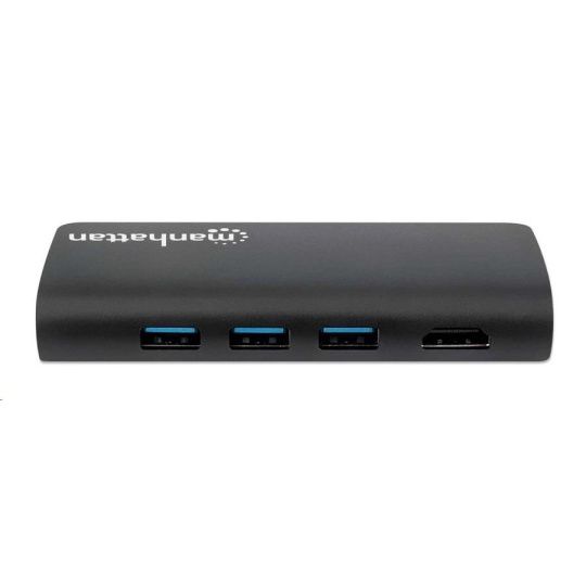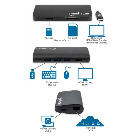 USB 3.2 Gen 1 Type-C Male to HDMI (4K@30Hz) Female, Three SuperSpeed USB-A Ports, USB-C Power Delivery (PD 3.0) Port, Gigabit RJ45 Port and SD/MicroSD Card Reader; Aluminum, Black