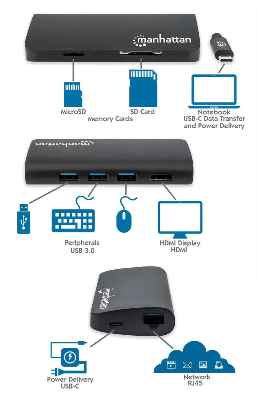 USB 3.2 Gen 1 Type-C Male to HDMI (4K@30Hz) Female, Three SuperSpeed USB-A Ports, USB-C Power Delivery (PD 3.0) Port, Gigabit RJ45 Port and SD/MicroSD Card Reader; Aluminum, Black
