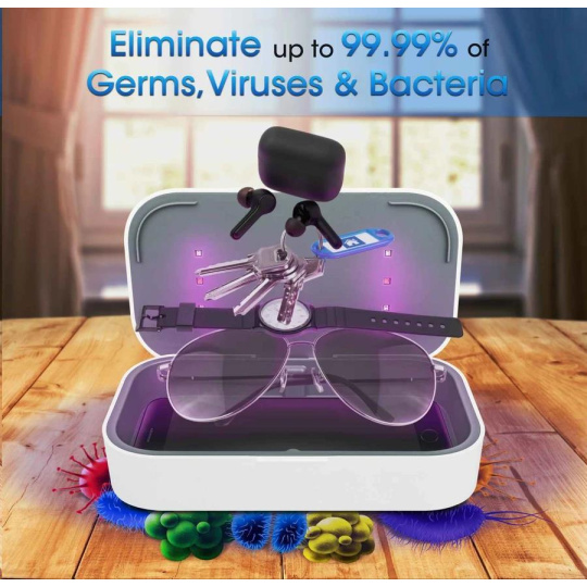 - Sanitizes smartphones, watches, keys, jewelry, credit cards, masks, pacifiers, earbuds and more