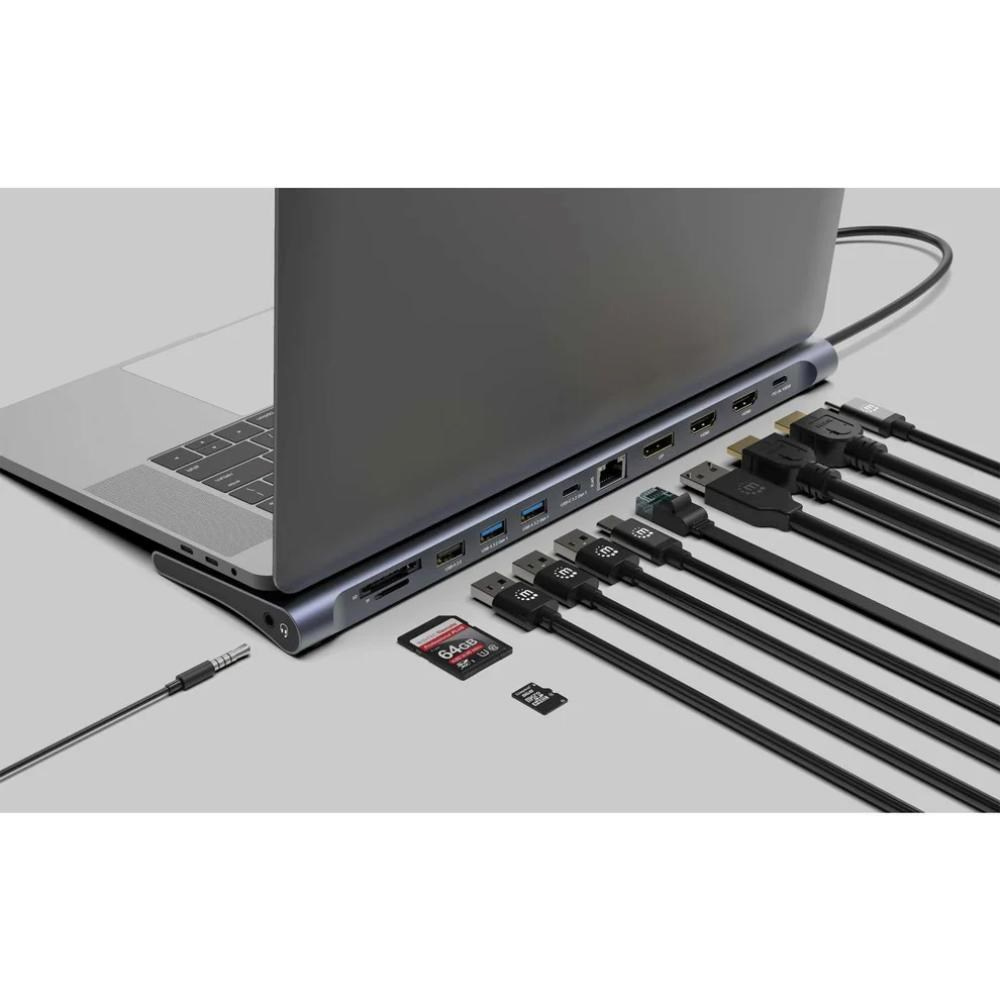 Rozšiřte možnosti připojení svého zařízení pomocí multiportového adaptéru Manhattan 12 v 1. Tato všestranná dokovací stanice vyplní mezery ve vašem notebooku nebo MacBooku a nabídne základní připojení, jako je HDMI, DisplayPort, Power Delivery, Ethernet, čtečka karet, audio a USB porty.
