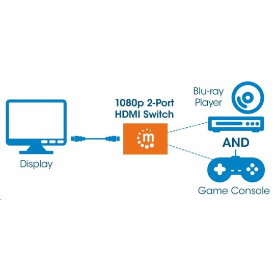 Easily connect multiple HDMI sources to a single display.The Manhattan 1080p 2-Port HDMI Switch connects two HDMI video sources — including gaming consoles, Blu-ray players, satellite receivers, digital recorders, set-top boxes and other devices — to a single high-definition display.Flexible Solution for Many HD ApplicationsWith the increased number of high-definition media devices available, the Manhattan 1080p 2-Port HDMI Switch expands the connectivity options for your HDTV, flat-panel display monitor or video projector. The switch automatically detects and selects the active HDMI source and routes the signal to your display. Additionally, its manual selection button allows users to select sources when more than one HD video source is on at the same time.Best Possible Image QualityFull compliance with HDMI and HDCP 1.0 and 1.1 ensures that the Manhattan 1080p 2-Port HDMI Switch provides high-quality performance and reliability. It delivers full 1080p resolution images and supports 3D video as well as LPCM, DTS and Dolby TrueHD audio.