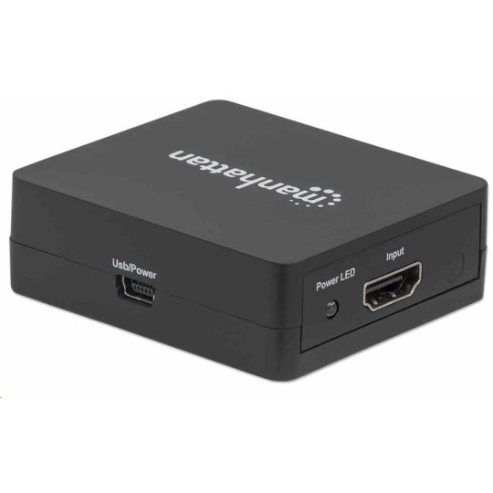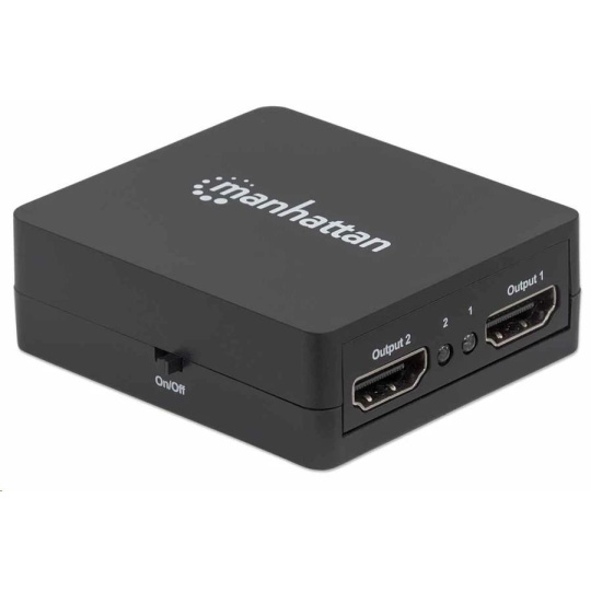 Easily distribute a single HDMI signal to multiple displays.The Manhattan 1080p 2-Port HDMI Splitter sends HDMI signals from a single Blu-ray player, satellite receiver, digital recorder, set-top box, game console or other HDMI source to two HDMI displays. Flexible Solution for Many A/V ApplicationsIdeal for trade shows, classrooms, video conferencing, presentations and retail applications, the Manhattan 1080p 2-Port HDMI Splitter features a built-in booster for added signal strength. It’s also a good choice for splitting and distributing a synchronous signal to multiple HDMI displays when source equipment is remotely stored in a secured room or cabinet. Users can cascade multiple units up to three levels and output HDMI video/audio to additional displays in widely distributed applications.Quality Construction and Easy InstallationFull compliance with HDMI, HDCP 1.0, 1.1 and 1.2 as well as DVI 1.0 ensures that the Manhattan 1080p 2-Port HDMI Splitter can provide long service and reliable performance. Quickly connect HDMI cables (not included) and the USB power cable, and this affordable HDMI solution is complete — no complicated settings or software or hardware configurations necessary.