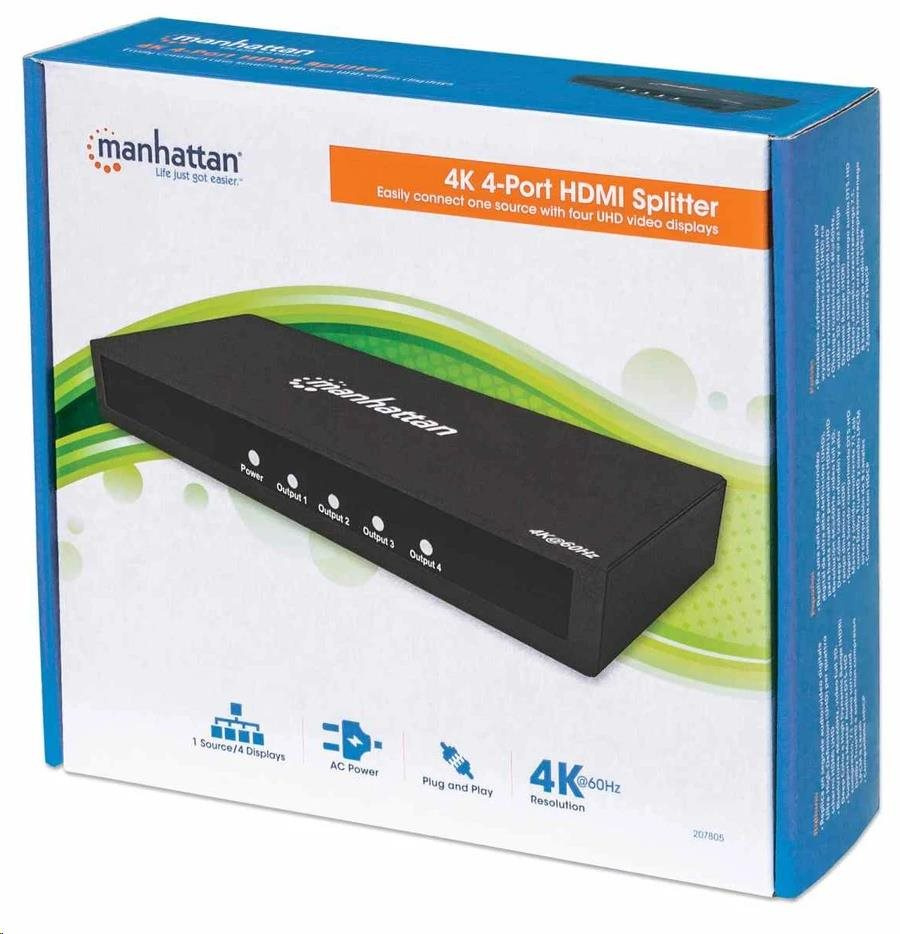 Manhattan HDMI rozdělovač, 4K 4-Port HDMI Splitter, 4K@60Hz, AC Powered, černá