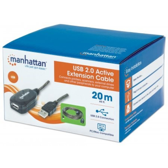 Use the Manhattan Hi-Speed USB Active Cable to connect a computer USB port to a USB device almost anywhere in the room. Daisy-chain 2 cable extensions to provide a convenient, 40m (131-ft.) connection. Manhattan Hi-Speed USB Active Cable with built-it repeater is fully-compliant with USB 1.1 and Hi-Speed USB specifications to help devices operate at maximum performance. Plug-and-play capability, Windows/Macintosh versatility and no external power or driver requirements help provide greater flexibility in computer and peripheral placement and office layout.