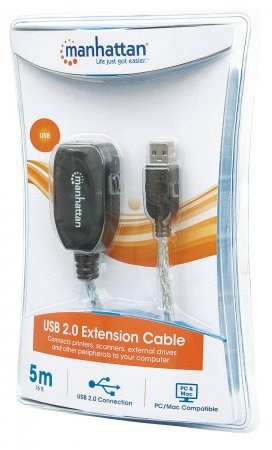 Use the MANHATTAN Hi-Speed USB Active Cable to connect a computer USB port to a USB device almost anywhere in the room. Up to three, daisy-chainable cable extensions provides a convenient, 15 m (50 ft.) connection. MANHATTAN Hi-Speed USB Active Cable with built-it repeater is fully-compliant with USB 1.1 and Hi-Speed USB specifications to help devices operate at maximum performance. Plug and Play capability, Windows7/8/Macintosh versatility and no external power or driver requirements help provide greater flexibility in computer and peripheral placement and office layout.