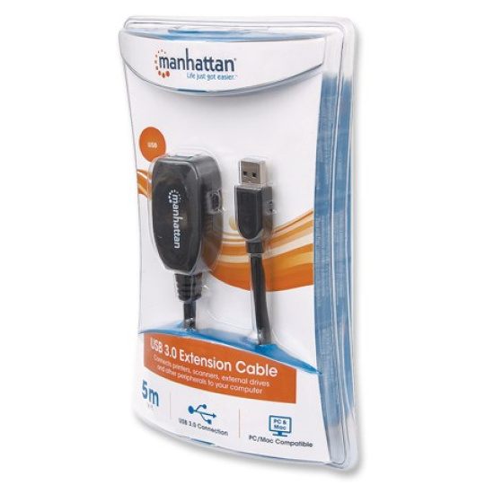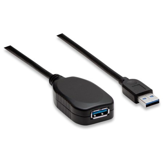 Use the Manhattan SuperSpeed USB Active Extension Cable to connect a computer USB port to a USB device almost anywhere in the room. Extend 5 meters more to the existing connection without signal loss. Manhattan SuperSpeed USB Active Extension Cable with built-in repeater is fully compliant with USB 3.0 and earlier specifications to help devices operate at maximum performance levels. Plug-and-play capability, Windows/7/8.1/10/Macintosh versatility and no external power or driver requirements help provide greater flexibility in computer and peripheral placement and office layout.