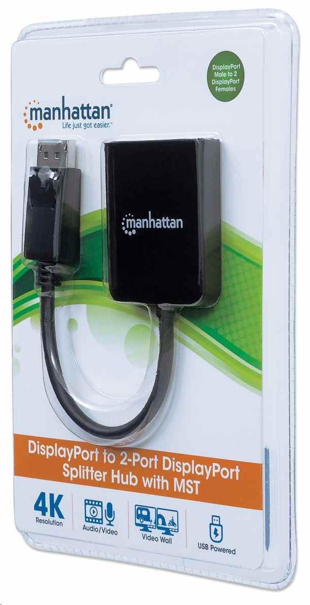 The Manhattan DisplayPort to Dual DisplayPort - MST Hub streams a 4K DisplayPort (DP) signal from a single UHD source to up to two UHD displays.