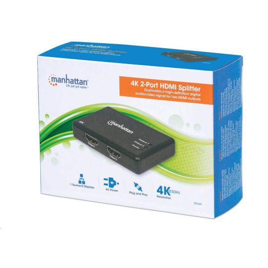 Ideal for trade shows, classrooms, video conferencing, home theater, presentations and retail applications, the Manhattan 4K HDMI Splitter features a built-in booster for added signal strength. It’s a good choice for splitting and distributing a synchronous signal to multiple 4K HDMI displays when source equipment is remotely stored in a secured room or cabinet. Cascade multiple units up to three levels to output HDMI video/audio on additional displays in widely distributed applications.