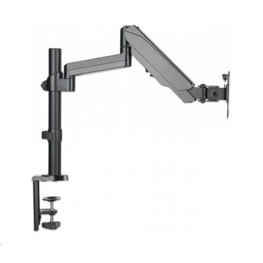 The Manhattan Universal Gas Spring Monitor Mount securely supports one 17" to 32" TV or monitor. Because it uses a gas spring to hold your display, its arm only needs the lightest touch to move your screen to the best viewing angle for you. The mount's high-quality aluminum and steel construction will provide years of reliable service. Ideal for installation on a standard-sized desk, the Manhattan Universal Gas Spring Monitor Mount lets you take advantage of the extra range of movement so you can have more space to get work done.