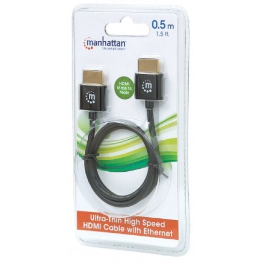 MANHATTAN Ultra-thin High Speed HDMI Cable with Ethernet, HEC, ARC, 3D, 4K, HDMI Male to Male, Shielded, Black, 0,5m
