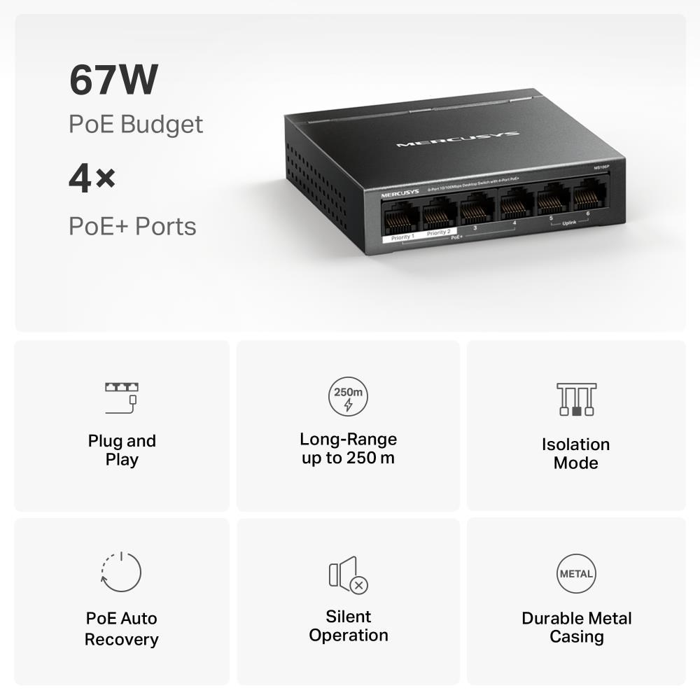 MERCUSYS switch MS106P (6x100Mb/s,4xPoE+,67W,fanless)