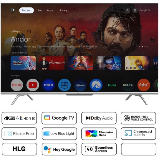 Google TV, LED, 165cm, 4K Ultra HD, 50/60 Hz, HDR10, DVB-T2/S2/C, 3× HDMI, 2× USB, CI+, USB nahrávání, LAN, Bluetooth, Chromecast, Miracast, herní režim, hlasové ovládaní, Google Assistant, párování s mobilním zařízením, Oneplay, VESA 400×200, DTS Studio Sound, energetická třída F. Evropská distribuce..